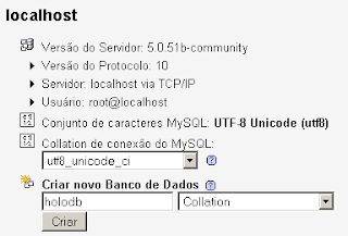 Entre no Link: https://localhost/phpmyadmin/, insira a sua senha e efetue o login (login: root; senha: a que você criou). Logo abaixo de onde está escrito "Criar novo Banco de Dados", coloque escreva "holodb" e clique em "Criar" !